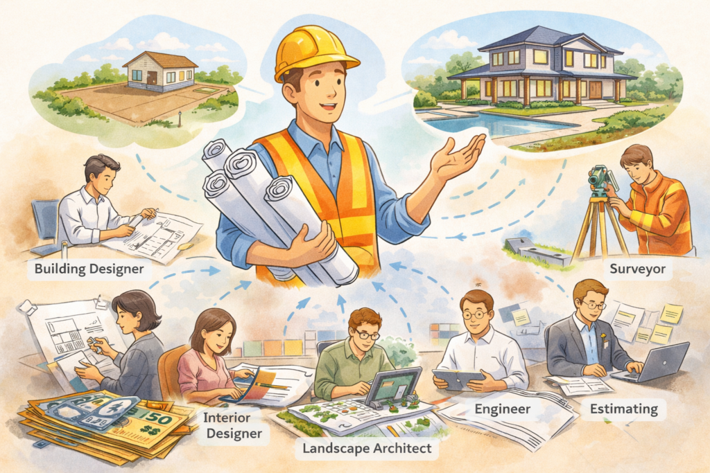 但如果你真正理解 custom build 的運作方式,就會明白 builder 想講的,不是「收貴你」,而是整個項目在正式施工之前,其實已經有大量真實工作正在發生,而且這些工作本身就需要專業人手、時間和成本。澳洲 custom home 的常見流程,本來就不是先隨便報個價再慢慢改,而是先經過 pre-design、設計深化、施工圖、工程資料和報價整理等階段,之後 builder 才有較扎實基礎去推進項目。