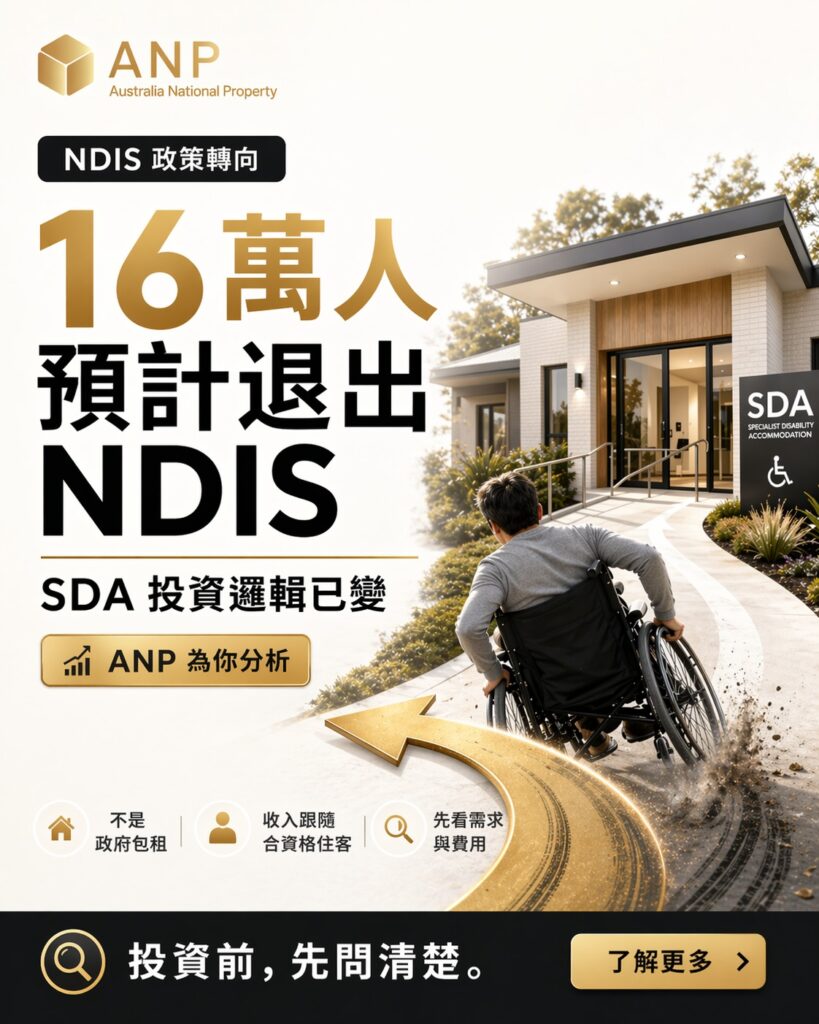近日澳洲政府宣府的 NDIS 改革再成焦點,將會收緊資格審核,未來或由「診斷為本」改為「功能評估為本」,預計約 16 萬名參與者可能不再符合 NDIS 資格 ⚠️雖然目前未有資料顯示當中有多少人直接涉及 SDA,但這個政策訊號,已足以令投資者重新審視相關風險。